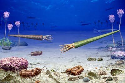 Самые известные представители головоногих — ортоцерасы. Их мягкое тело напоминало современных осьминогов, но в отличии от осьминогов ортоцерасы имели длинную прямую раковину, сильно напоминавшую прямой рог. Отсюда и их название “ортоцерасы”, что в переводе значит “прямой рог”. Их длина достигала 1 метра. Плавали ортоцерасы раковиной вперед, а в спокойном состоянии повисали с помощью воздушных камер и хватательных щупалец, распуская их как парашюты. Ортоцерасы—предки всех головоногих, имевших перегородки. Их потомок — наутилус — живет и в настоящее время.