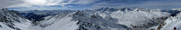 Вчера вместо работы сходили с С.В. на давно запланированную Testa Grisa (она же Pointe de Moline). Неплохой спуск по жесткому снегу и еще одна панорамка в коллекцию (как обычно, кликабельна):