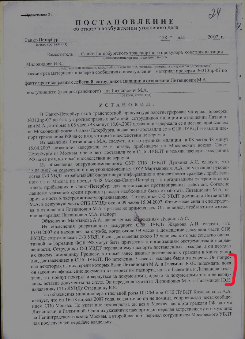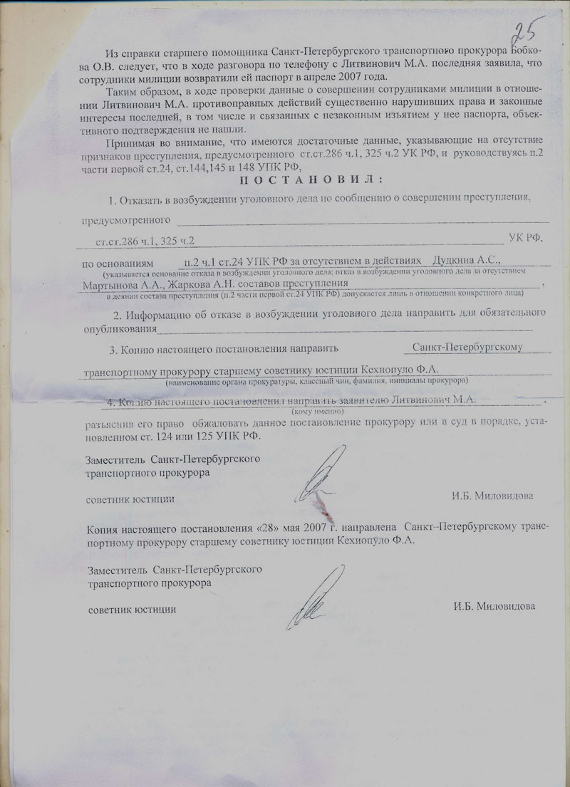 Под катом публикую Постановление транспортной прокуратуры СПБ об отказе в возбуждении уголовного дела против сотрудников милиции по моему задержанию 15 апреля, действия которых я обжаловала. Как дело обстояло и чем я недовольна написано тут.