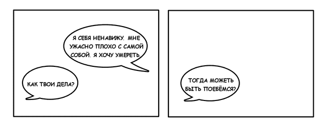 Мне действительно уже давно ничего не нужно от неё. Ей нечего мне дать, и никогда не было. По инерции у меня остался к ней лишь один вялый интерес: как к женщине. Но, глядя на неё, я сильно сомневаюсь, что даже в этом плане что-то могло бы получиться. Всё равно как ебать едва живую девочку-заморыша из концлагеря. Уж лучше оставаться при остатках своих иллюзий и фантазий. А девочку -- покормить, да только она отказывается и верит, что ей ангелы принесут пищу. Она в глубокой жопе. И я вместе с ней (((
