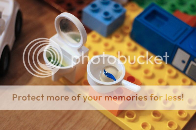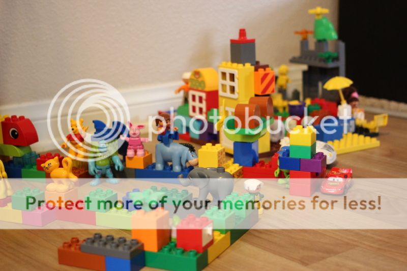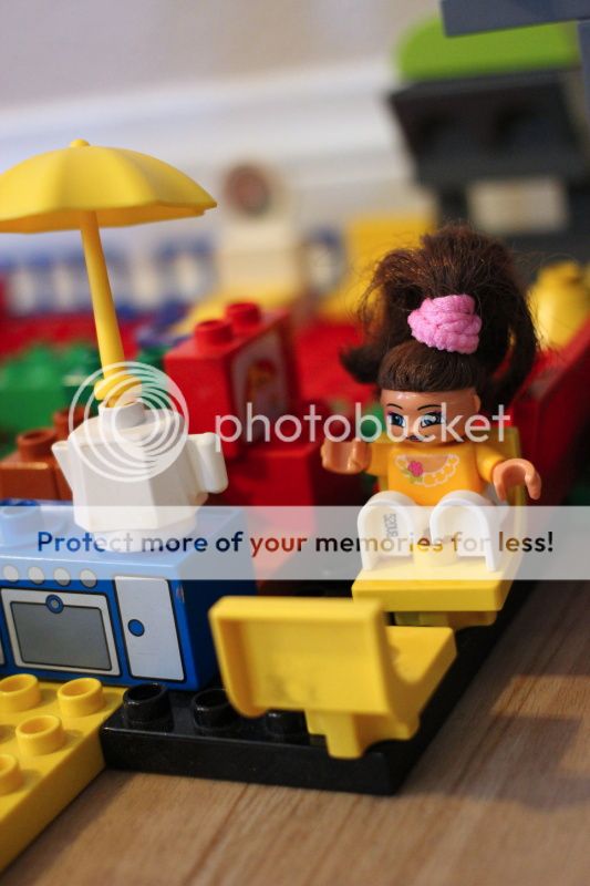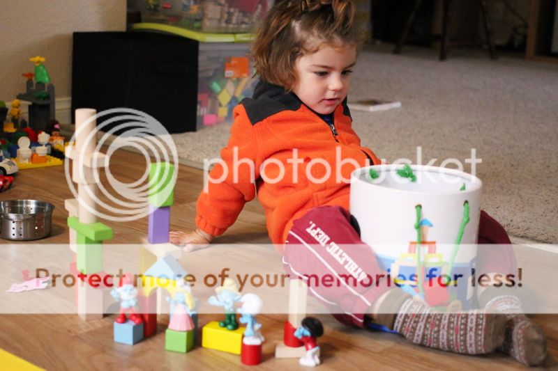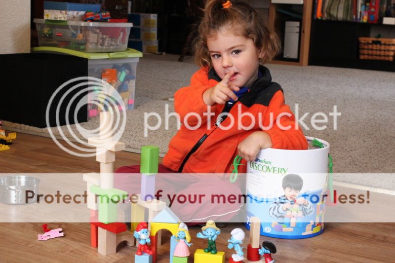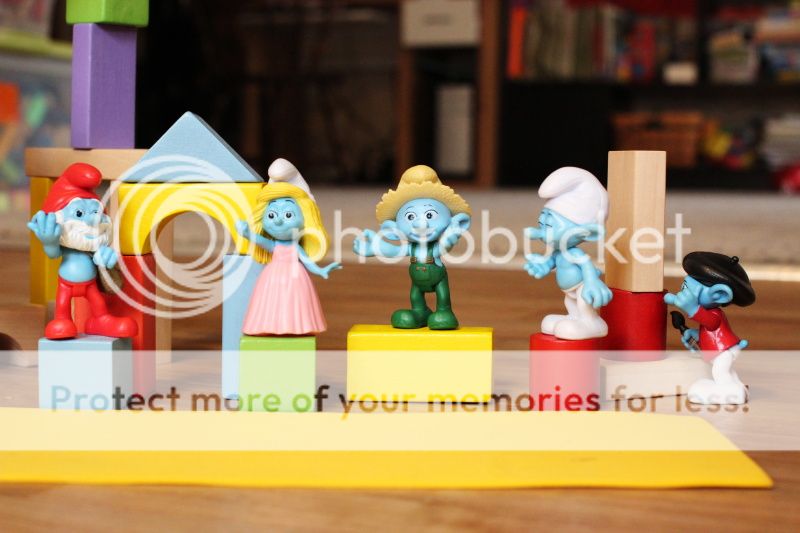 далеко не уползая, Ева достала кубики и смурфиков (вот тут меня уже кривит... я уже несколько месяцев в смурфиков играю... тут я реально стала отпрашиваться у нее, чтобы помыть посуду, чтобы мураши не напали на нас;))
