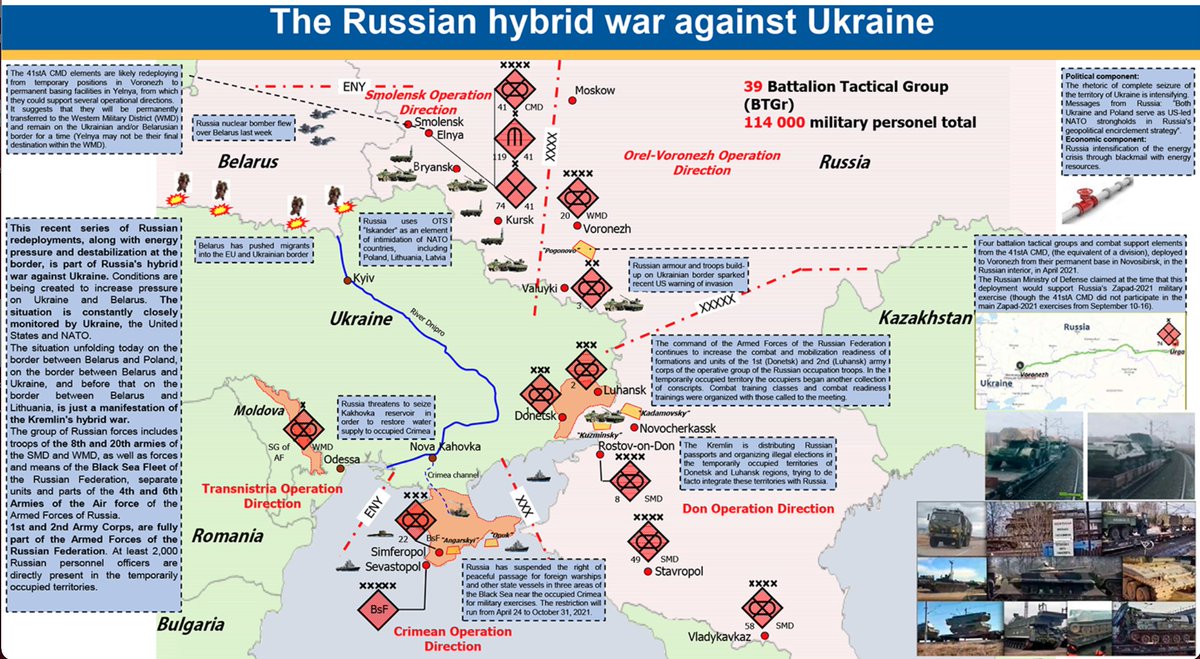 «Россия сконцентрировала более 92 тысяч военных возле границ с Украиной и готовится к нападению в конце января или начале февраля 2022 года. Атака, вероятно, будет включать авиаудары, артиллерийские и бронетанковые удары, за которыми последуют воздушно-десантные атаки на востоке, десантные атаки в Одессе и Мариуполе и меньшее вторжение через соседнюю Беларусь», – отметил Буданов. Началу вторжения России, по его мнению, будет предшествовать «серия психологических операций, которые проводятся для дестабилизации Украины. Они хотят разжечь беспорядки путем протестов и митингов, которые покажут, что люди выступают против правительства. Они хотят сделать ситуацию внутри страны более опасной и жесткой, сделать так, чтобы мы сменили власть. Если они не смогут этого сделать, то войска сделают свое дело».