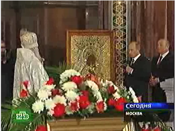 ...президент Владимир Владимирович дарит храму икону Владимирской Божьей Матери...