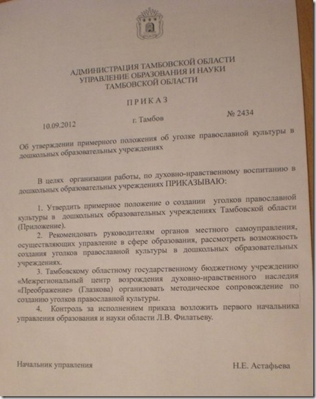 В начале учебного года в Тамбове после приказа управления образования и науки Межрегиональный центр возрождения духовно-нравственного наследия "Преображение" совместно с Тамбовской епархией РПЦ организовывал методическое сопровождение по созданию в дошкольных учреждениях уголков православной культуры. Предполагалось, что в них будут находиться иконы, свечи, лампадки, мультфильмы, сказки на кассетах и некая "духовная литература".