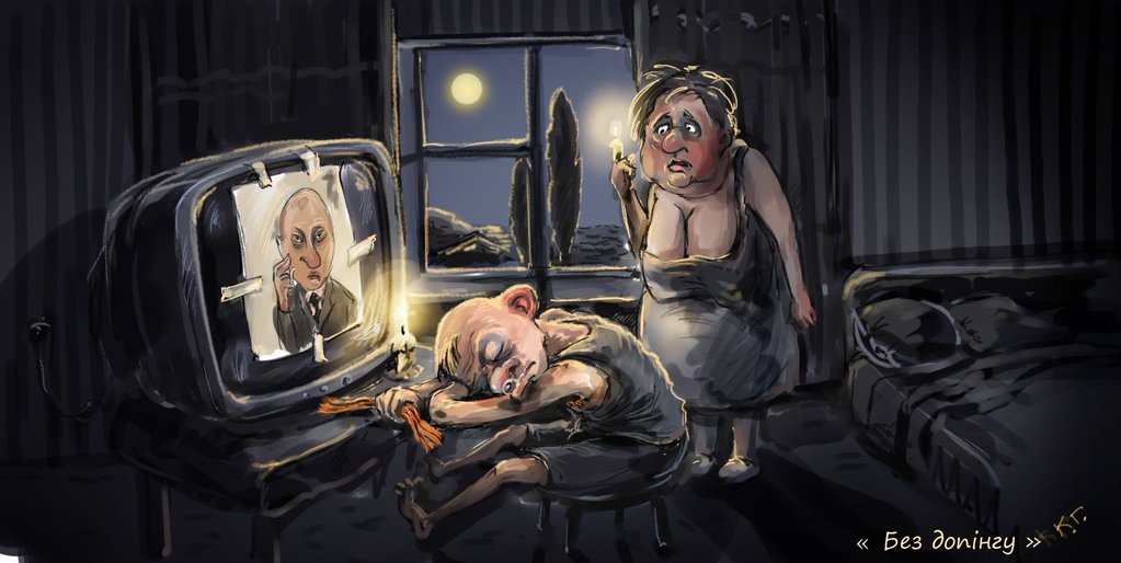 В Крыму полный п., света почти нигде нет, бензина почти нигде нет, люди готовят еду на кострах, но в тоже время на площадях поставили телики, по которым целый день показывают Путина. Еще баннеры с Путиным подсвечивают при полной темноте кругом.