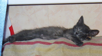 Теперь, когда у Тинки нет возможности спать, лежа на мне, она устраивается на батарее. Мне страшно, что она там зажарится, поэтому на батарею положено большое, сложенное много раз полотенце, а сверху ещё одно. :) Сегодня Тинки вытянулась вот в такую ржачную позу. Устал ребёнок - носилась, носилась, потом пришёл Айболит и уколол в холку, потом опять носилась, носилась, ела и вот... :))