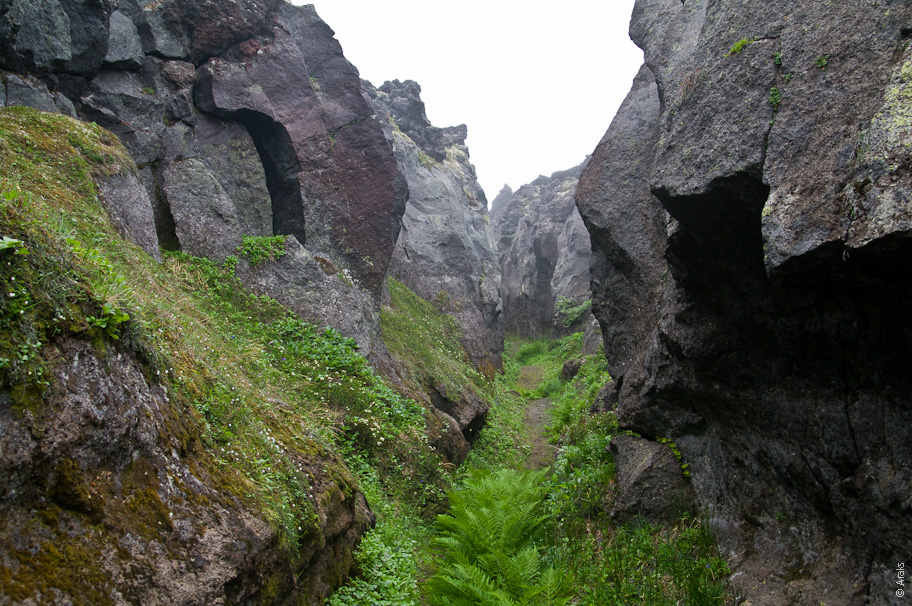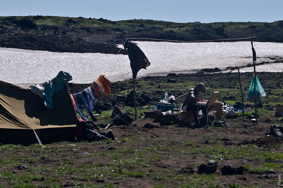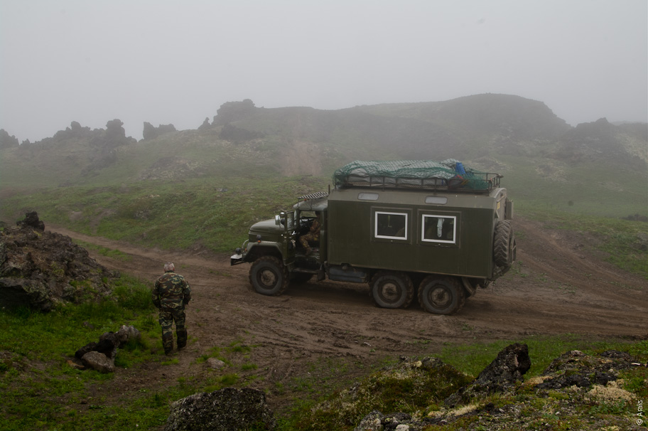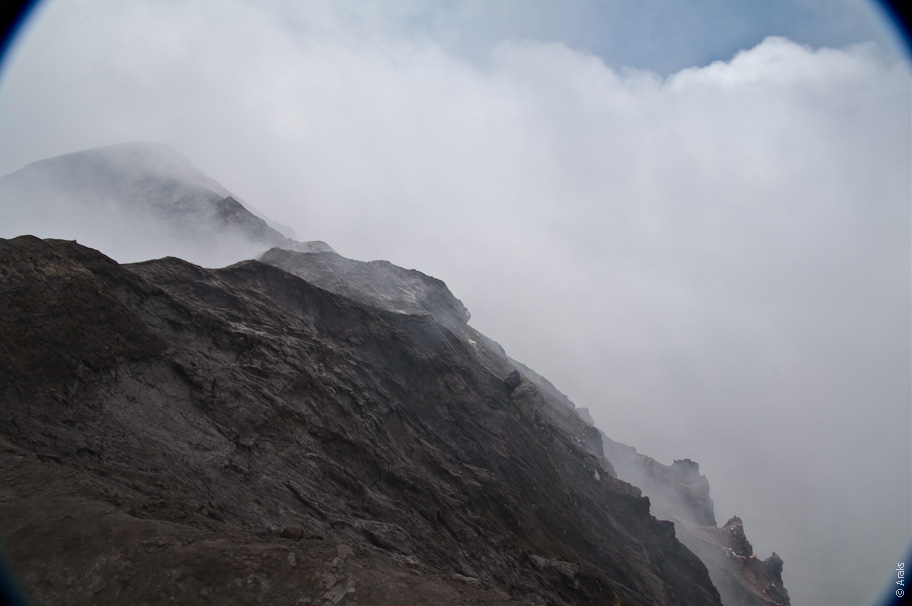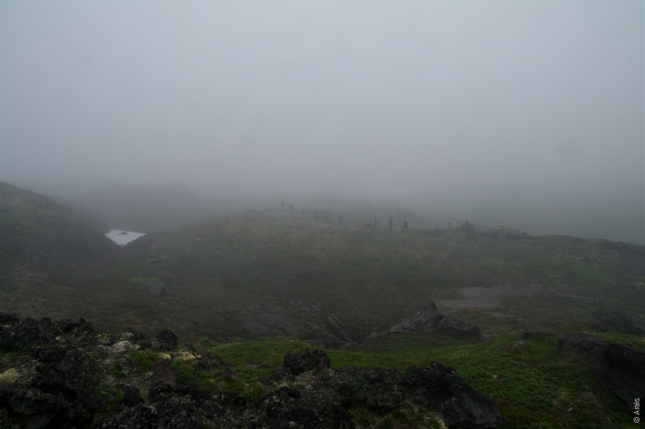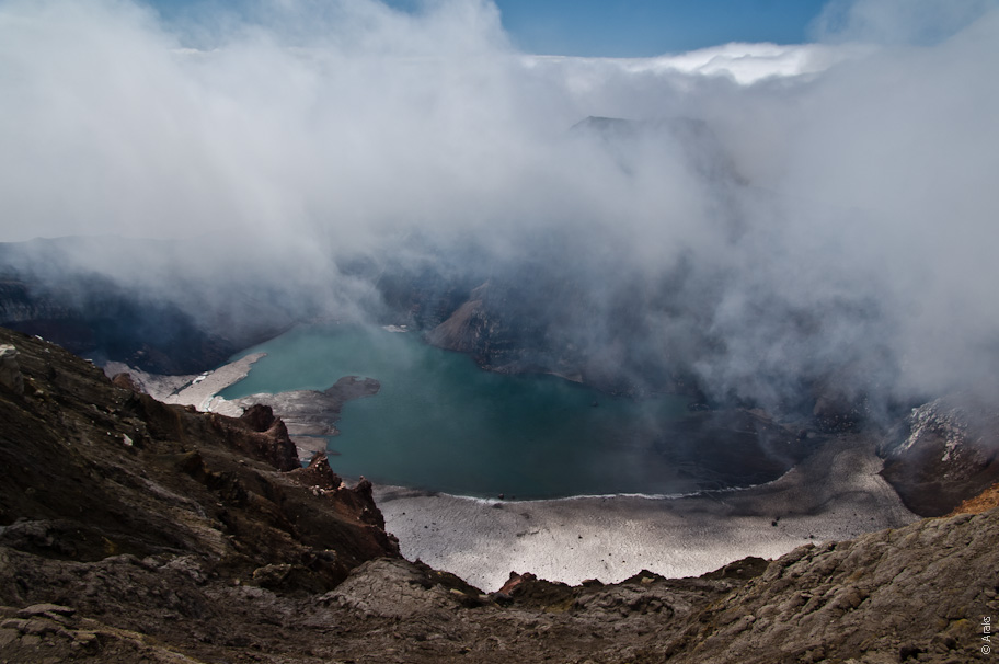 Удалось увидеть, только на несколько секунд, самый большой кратер - Голубое Озеро. Потом опять всё затянуло облаком и дымом. Дышать здесь порой тяжело. Воздух насыщен сероводородом.