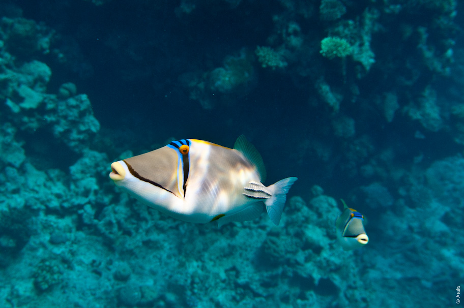 Ринекант Пикассо красноморский (Rhinecanthus assasi). Длина тела до 30 см. Питается в основном крабами, червями, иглокожими. Встречается только в Красном море.