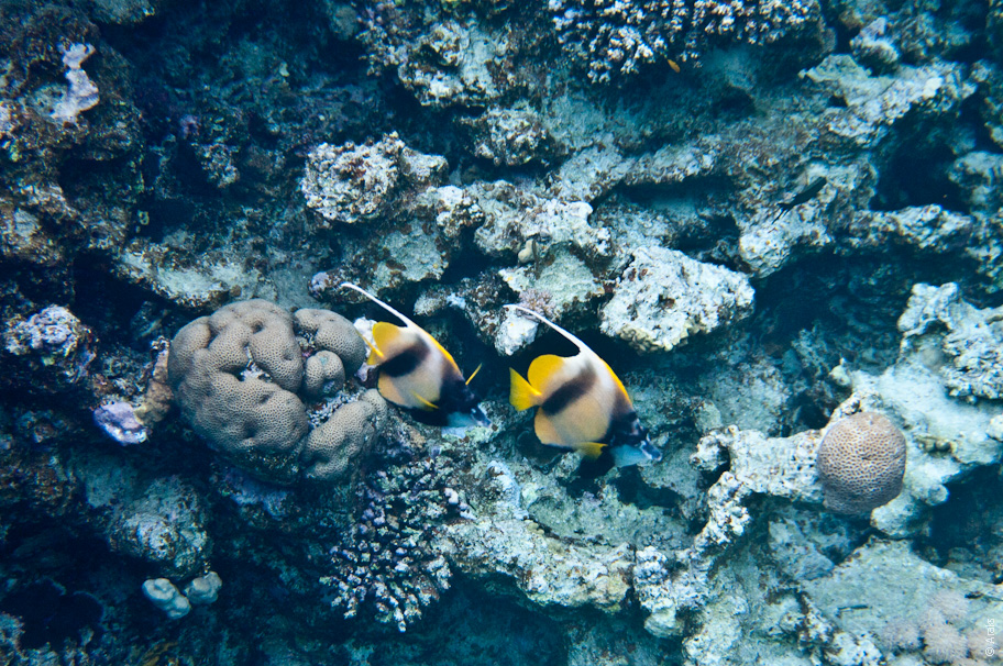 Кабуба красноморская (Heniochus intermedius) англ. Red Sea bannerfish. Принадлежит к семейству щетинозубых, это большое семейство ярко окрашенных рыб, включающее около 120 видов. Длина до 20 см, активная днем стайная рыба, питается зоопланктоном. Временами плавают парами, тогда они очень территориальны. Центром территории бывает столовый коралл, обе рыбы движутся к границам своей территории, и угрожают соседям того же вида, но пропускают других рыб–бабочек.