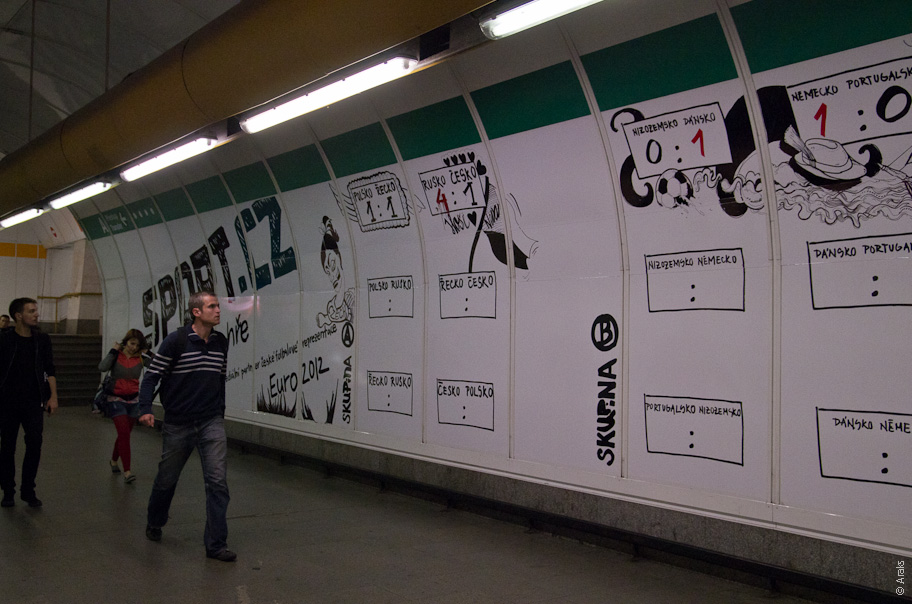 Приехал в город в аккурат после знаменательного матча. Переход между линиями пражского метро. Замечательно организована оплата проезда, понятна даже без знания чешского языка. Любителям халявы (турникетов в метро нет) — контролёры очень любят туристов :)