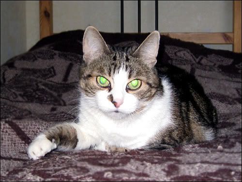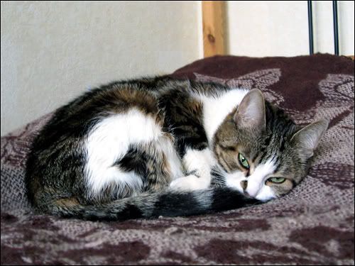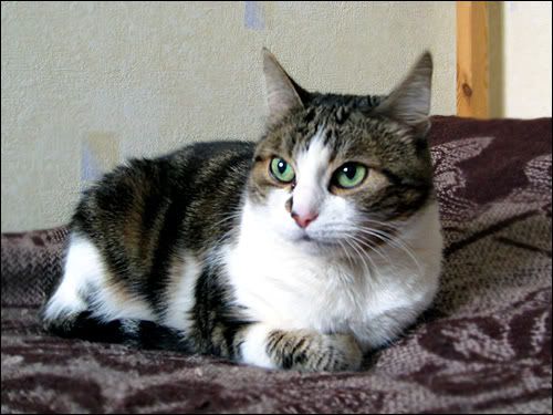 теперь же сама приходит, забирается на грудь и урчит, как трактор :)) и лижет руки, когда на них крем. и еще любит ложиться на мое шерстяное одеяло, соответствующее по цветам ее окраске, — маскируется)