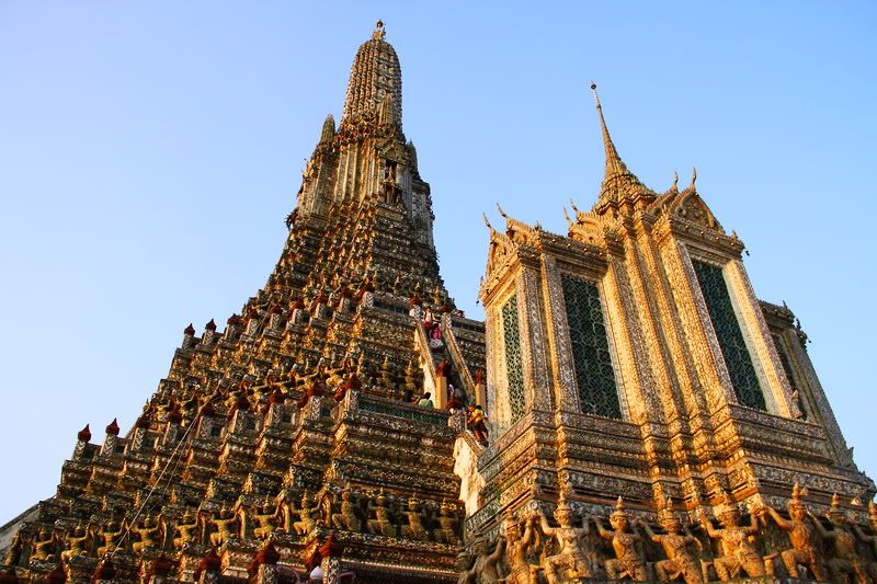 к этому прекрасному храму, издалека не особенно впечатляющему, зато вблизи еще как, мы приплыли на пароме ближе к закату. с площадки на верху храма открываются чудесные виды на реку Чао Прайю и центр Бангкока, поэтому туда обязательно надо взобраться и полюбоваться всем этим своими глазами.
