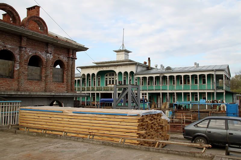 старое деревянное здание речного вокзала стоит на воде, и рядом же на берегу строится новое: