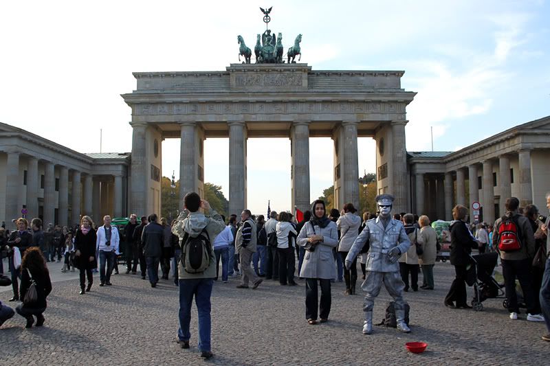 2. стартуем от Бранденбургских ворот — пожалуй, самого центрального места в городе. здесь всегда много людей, все фотографируют и фотографируются. некоторые приходят сюда прямо с чемоданами. и, как всегда в таких людных местах, не обходится и без мимов.
