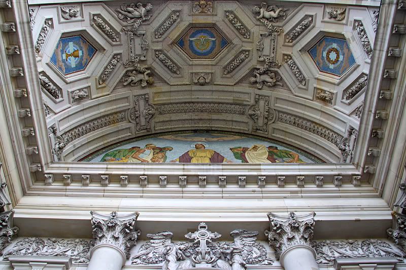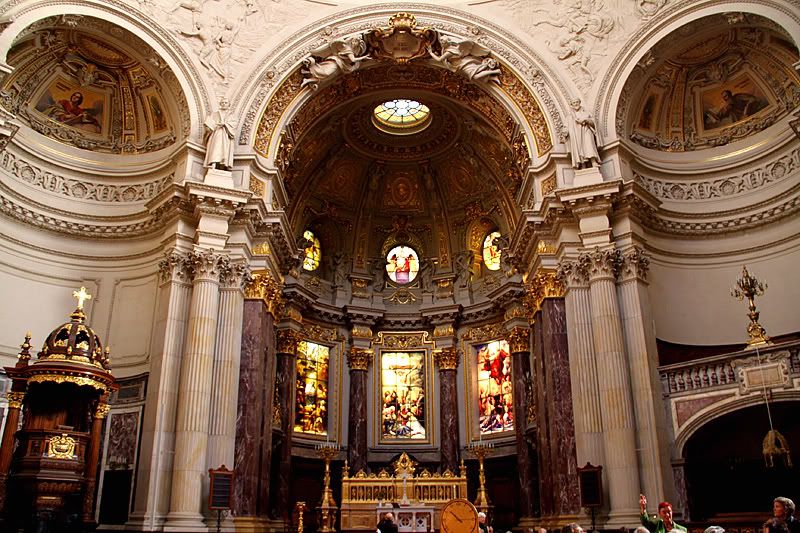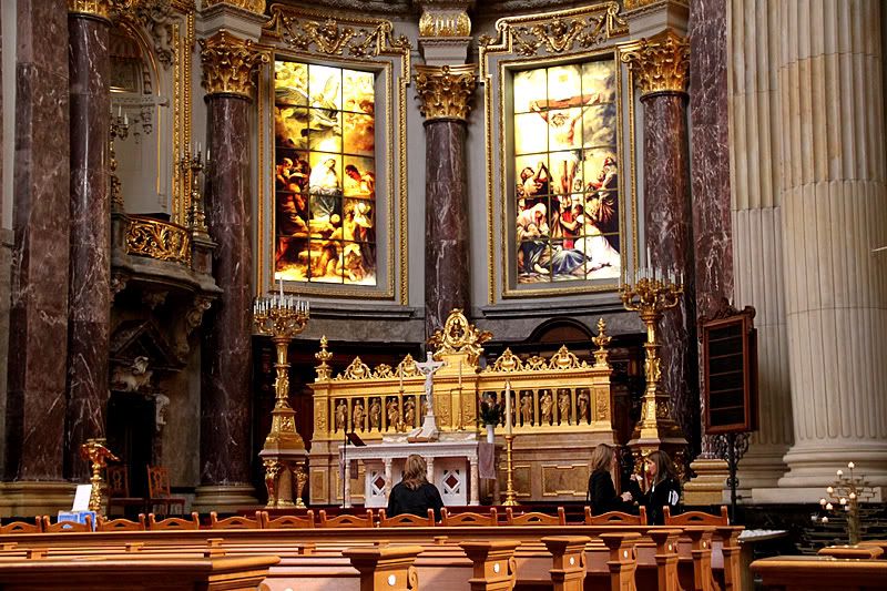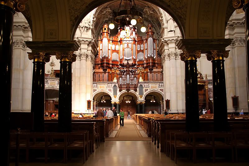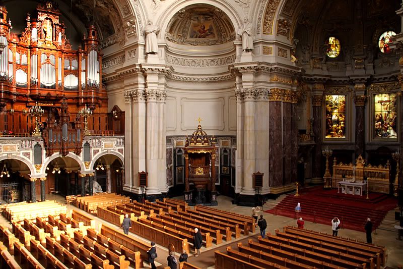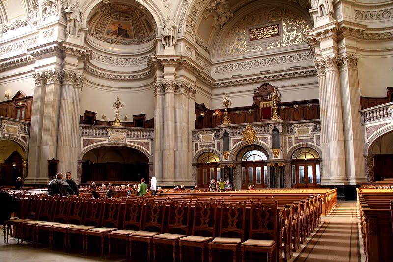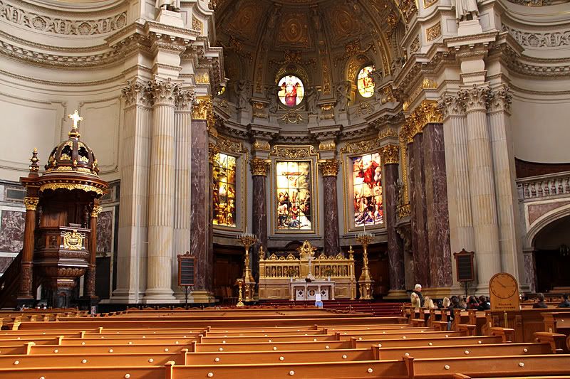 Берлинский кафедральный собор, или Berliner Dom, — самая большая протестантская церковь Германии. Собор строился с 1894 по 1905 годы, серьезно пострадал во время Второй мировой войны: бомба попала в его купол, и он простоял около 50 лет обезглавленным, а был реконструирован только в 1993 году. Для посетителей собора также открыт склеп династии Гогенцоллернов, где представлены 70 из 89 сохранившихся захоронений, среди них — роскошный саркофаг Великого курфюрста Фридриха Вильгельма I и его жены Доротеи.