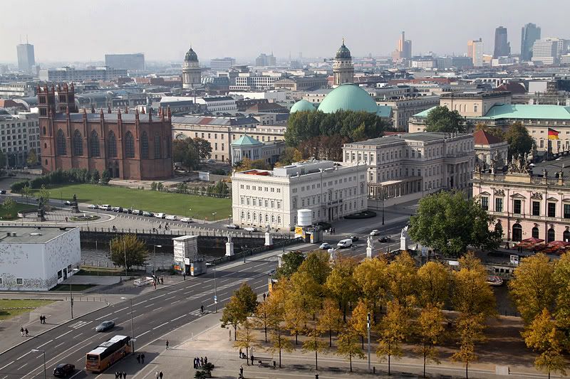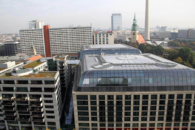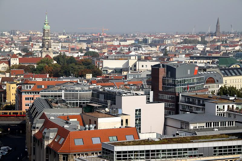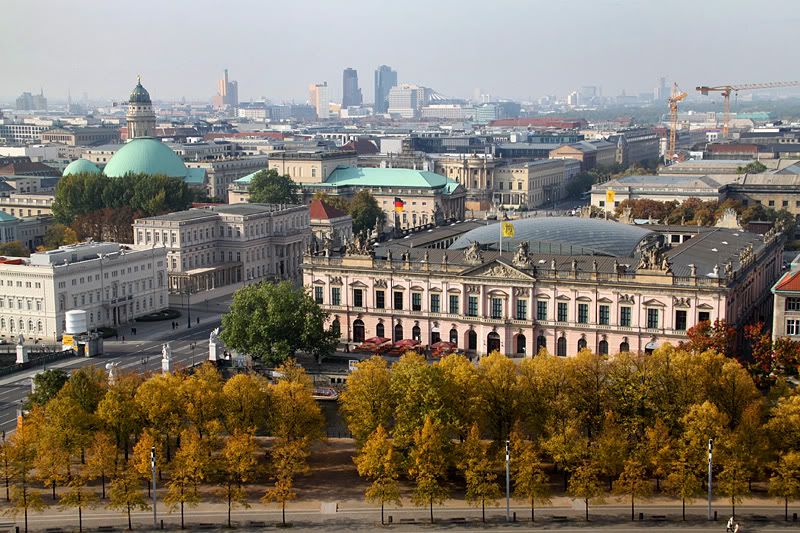 33. самое интересное видно, конечно, в сторону центра. слева направо: оперный театр и один из соборов-близнецов на площади Жандарменмаркт, большой зеленый купол церкви святой Ядвиги, на заднем плане высотки Потсдамер Платц и купол Сони-центра, а на переднем плане красивое розовое здание Цейхгауза, и за ним по диагонали кадра слева направо тянется Унтер-ден-Линден.