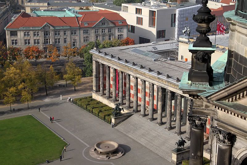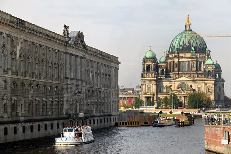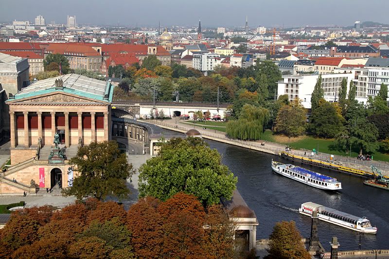 31. на переднем плане Старая национальная галерея, по центру — золотистый купол синагоги, а внизу — снующие туда-сюда теплоходики на Шпре.
