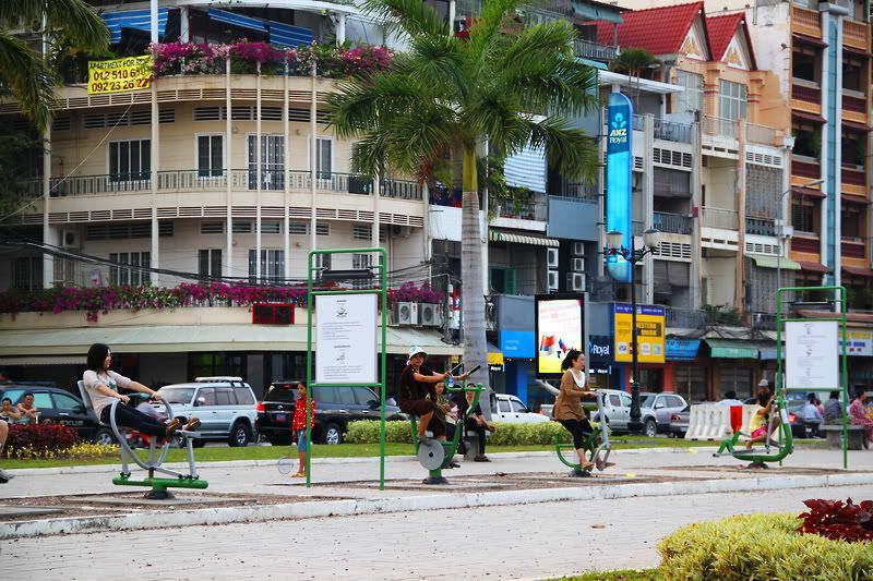 4. камбоджийцы с удовольствием занимаются на тренажерах, установленных тут же. такие же я видела в хорватском Дубровнике и вьетнамском Хошимине.