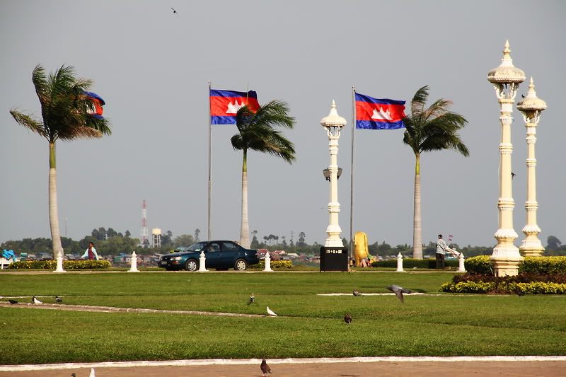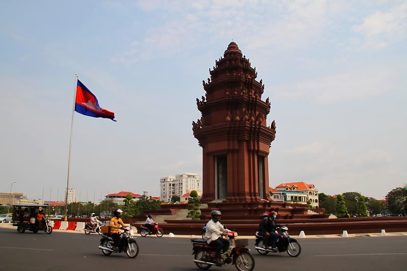 14. монумент независимости и камбоджийский флаг с Ангкор Ватом на нем.