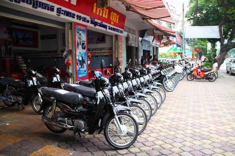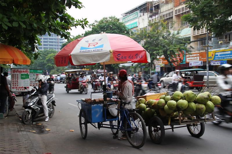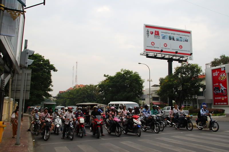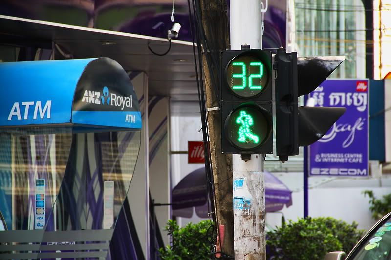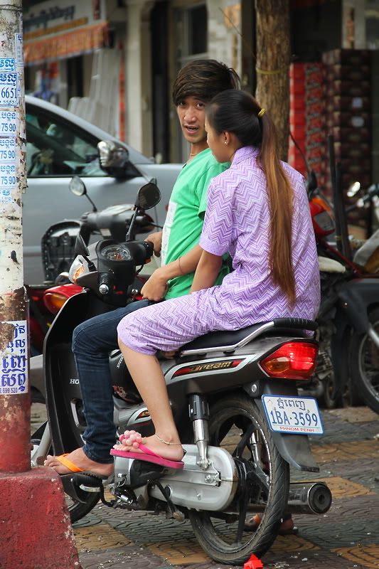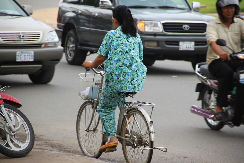 основной транспорт в городе - скутеры и велосипеды. трафик на улицах очень плотный, иногда приходится подолгу ждать, чтобы перейти дорогу. причем пешеходные переходы, обозначенные "зебрами" асфальте, никакого значения не играют, никто не пропускает пешеходов. кроме того, все тротуары заставлены припаркованными автомобилями и байками, или еще как вариант - широко разложенными товарами из магазинов, что категорически лишает удовольствия от прогулок по городу. приходится, как и в Индии, продираться с регулярными выходами на проезжую часть сквозь джунгли всего, чем заставлены здешние тротуары. а еще после Индии, Непала и Таиланда очень удивило правостороннее движение в Камбодже. мы-то за три месяца привыкли к левостороннему, так что пришлось переучиваться заново :)