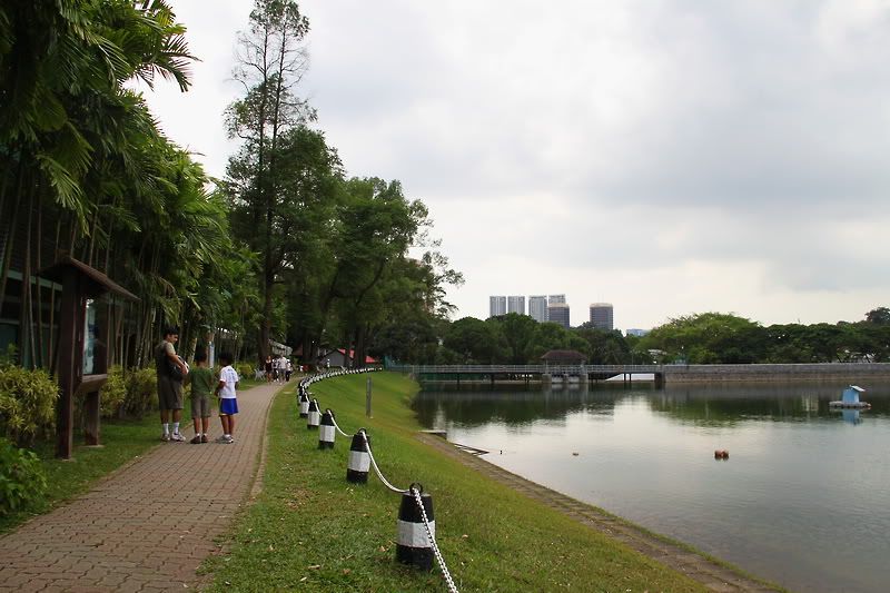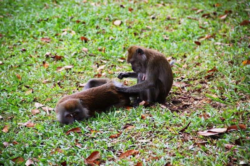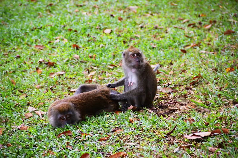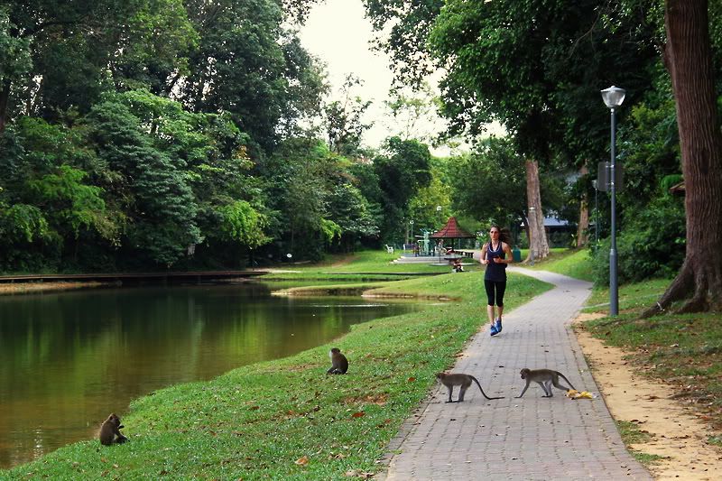 6. Обстановка тут очень спокойная, кто-то гуляет, кто-то бегает вокруг водоема, а прямо рядом - обезьяний животный мир.