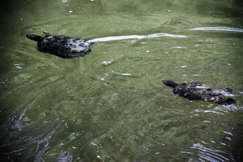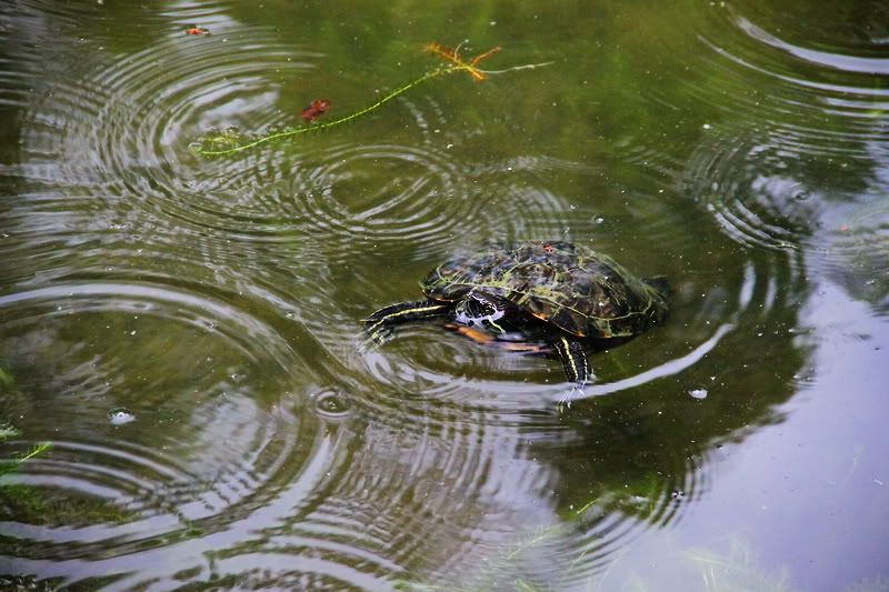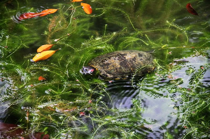 55. Пережидая дождь, разглядывали вот эту черепаху в водоеме, она довольно долго плавала вокруг нас и периодически высовывала голову из воды.