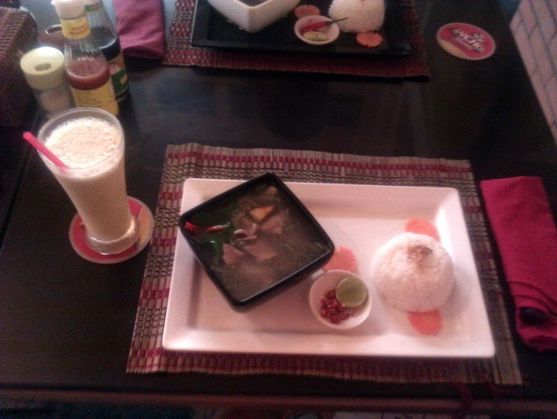 Ну, и кому интересно - мой сегодняшний обед в индийском ресторане. Суп из говядины с рисом и банановое ласси.