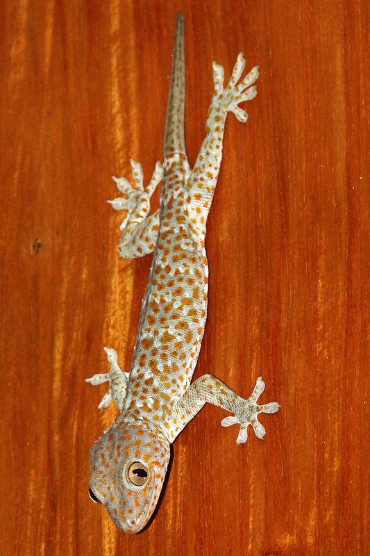 вот такие), то большие — пупырчатые и в оранжевую крапинку. При этом королевские гекконы еще пугливее обычных. Мы встречали такого прошлой зимой лишь однажды — в Таиланде, на веранде нашего домика на Ко Чанге. При нашем проявлении он сразу скрылся за углом дома и больше не попадался нам на глаза. Между собой мы в шутку называли его «крокодильчиком». Выглядел он вот так: