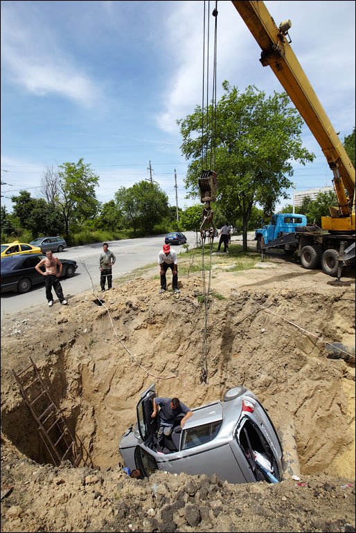 Любопытно, что лет двадцать назад на этом же перекрёстке, в двадцати метрах, в похожую канаву влетела "Волга", с тем отличием, что яма была до краёв заполнена водой и над её поверхностью остался торчать лишь стоп-сигнал подводной лодки.