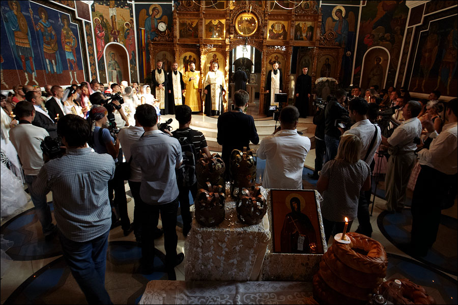 Первые выходные после Успенского поста, румынская церковь святой Теодоры Сихлской. Десяток танколимузинов у входа, от 7 до 11 пар одномоментно, 7 священников, 15-20 фотовидеооператоров, не считая гостей. По окончании обряда все выходят в одну дверь, одновременно в другую втягиваются следующие 7-11. P.S. Зевнул один момент – церковь относится к Румынской Патриархии, в ней проводятся венчания в субботу, в отличие от Русской Православной Церкви, где по субботам венчания запрещены. Многие хотят в один день провести и роспись, и венчание, и банкет, чем и объясняется массовое нашествие венчающихся в одной из немногих Кишинёвских румынских церквей. 1 ( + 5 шт., 800 кб )