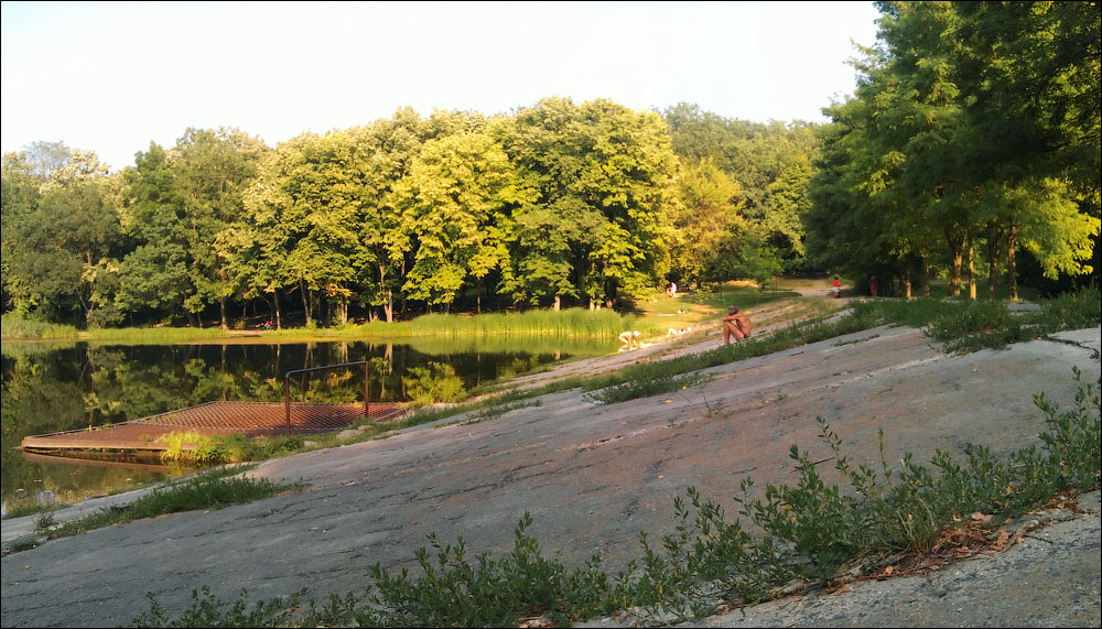 Озеро ниже «Парка афганцев» на Рышкановке. Воскресенье, шестой час вечера, жарко. Вода не выглядит грязной, о всяческой бацилле пока говорить не будем.