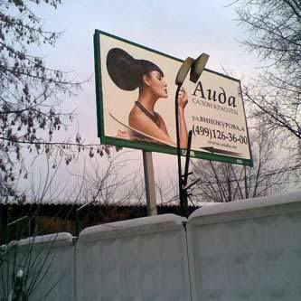 вам, маркетологи: адресная программа салона красоты аида общий вид на савеловскую железную дорогу. ближайшая колея используется в технических целях, увидеть щит могут машинисты редких товарняков и их помощники. по наземному переходу через пути (он за точкой съемки метрах в 5-10) по утрам шагает в темноте смена на рыбоперерабатывающий завод, на авто подъезжают с другой стороны. с платформы, где останавливается электричка, щит не виден. из окна проходящей электрички за деревьями - ?  стоит борд за забором с колючкой. снято с точки, где проходят лишь путевые обходчики да бомжи с овощебазы может забредают.  номер конструкции 666 -- потому что салон аида?  до улицы винокурова, если верить гуглемапу, километров 30 на авто. по стрелке, видимо. до кучи: A-I-D-A у рекламщиков расшифровывается как Attention, interest, decision, action. ai налицо, плюс вирусный был бы маркетинг, если бы читали этот блог человек тыща. |