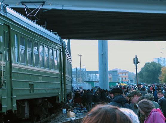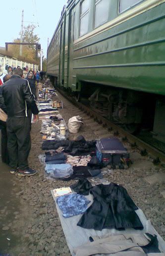 прибытие поезда лианозовская блоха (бывш. марк). товар лежит прямо на рельсах. иногда по ним идет поезд, и выкладку отодвигают: