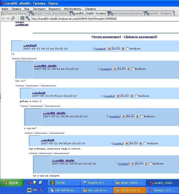 Сначала тут: http://satanov.livejournal.com/623411.ht Потом тут: http://caralh0-v0ad0r.livejournal.com/2 О, молодец, оперативно потер. ![]() Потом в аське: 16:59:39 МС ДэВИД®: привет 16:59:42 МС ДэВИД®: это mcdavid 16:59:50 caralh0_v0ad0r: ну. 17:00:29 МС ДэВИД®: добавь в тусу :)))))) 17:00:43 caralh0_v0ad0r: повторяю вопрос. с хуя ли? 17:01:09 МС ДэВИД®: ответил жеж дохуя в ней знакомых френдов моих :) 17:01:18 caralh0_v0ad0r: и что? 17:01:25 caralh0_v0ad0r: какая связь? 17:01:29 МС ДэВИД®: та нихуя 17:01:31 МС ДэВИД®: заюыли 17:01:33 МС ДэВИД®: *забыли 17:02:32 caralh0_v0ad0r: ок 17:02:54 МС ДэВИД®: ок Что движет этими людьми? А, чюваки, ![]() |