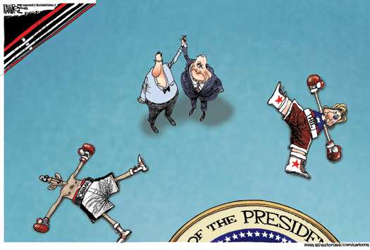 © Michael Ramirez, IBD Editorials Конечно, накал страстей среди демократов может внушить вполне радужные надежды. На мой взгляд, однако, МакКейну пока победу праздновать рано. Республиканцам было бы трудно, даже если бы у них был сильный кандидат, а у демократов - слабый; дело же обстоит в точности наоборот. Чтобы республиканец выиграл в этом году выборы, должно произойти чудо, а МакКейн не производит впечатления чудотворца. В отличие от Обамы. Конечно, демократы делают все, что могут, чтобы облегчить республиканцам жизнь, но даже их титанических усилий, боюсь, не хватит. Опубликовано в Записках Часовщика. Комментировать лучше там, но можно и здесь. | |||||