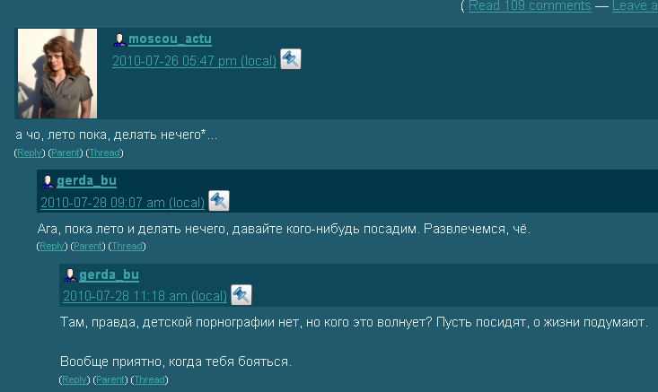 Вот вчерашний диалог мужика, забаненного в ЖЖД за защиту педофилии и одной из мутных теток же очень показателен. Как-то быстро выясняется, что дело не в том, что кто-то против или за педофилию, а в том, что обоим очень хочется нагадить ржл. И тут уже им не до идеологических разногласий - сливаются в объятиях.