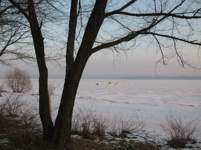 Но не все ловят рыбу или делают вид, что заняты этим полезным, но хищным промыслом! Некоторые запускают этих... ну, вроде воздушных змеев или планеров, что тоже смотрится очень эффектно на фоне льда, морозного неба и заката, отражающегося в громадах дальних домов.