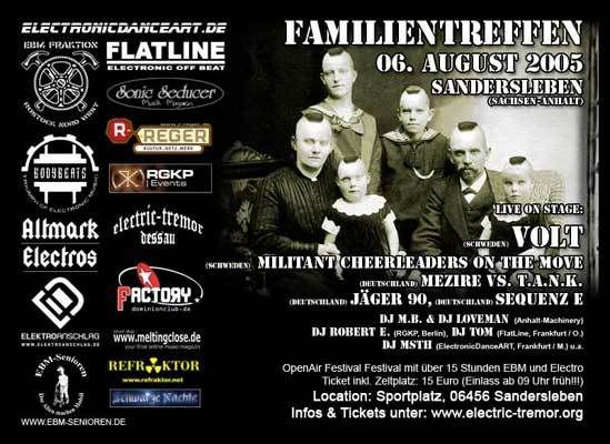 Some festivals surely do deserve the first prize for creating original posters (see above) ! Taking place in Sandersleben (Anhalt) - Germany from August 3 until August 5 is the open-air Familientreffen-Festival organised by the oldschool EBM organisation Electric Tremor. During the first two days you will be able to see 16 oldschool bands live at work including an almost complete Scandinavian line-up on day 2. The line-up for the complete fest is as follows....