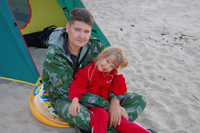 К реке выехали почти сразу, остановились на высоком берегу (вспомнился Урал, р.Исеть). Машину пришлось оставить тут, а самим спускаться с этого берега и топать ногами по песчанному пляжу на место где решили разбить палатку. От машины по прямой метров 300-400. Спуск с берега\горы весьма козлячий, для нас людей города крайне ебанут и неудобен. В течении часа я перетаскал палатки, спальники, жрачку, воду, дрова и все прочее - сделав 5 ходок туда-сюда. Я был выжат, силы уходили после кажого взбирания на гору и обратно с флягами и сумками, держа в зубах, то что не влезло в руки. Разбили палатку, кострище, поужинав жаренными на костре сосисками погуляли по пляжу.