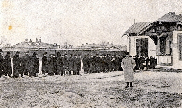 Въ ожиданiи очереди перед подачей записок въ одномъ изъ избирательныхъ участковъ.