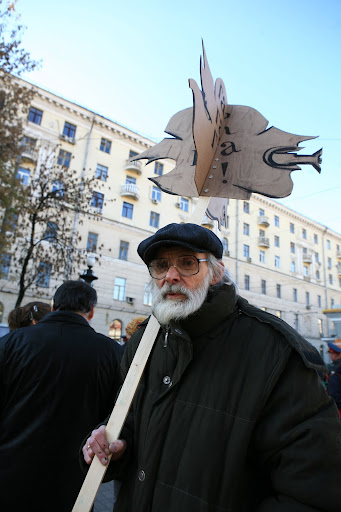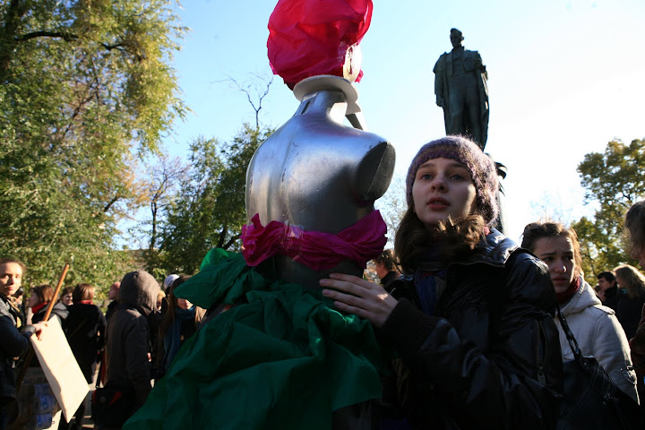 ![]() Несмотря на раннее время митинга (он начался в 11.30 буднего дня у памятника Грибоедову), а также кажущуюся узость проблемы, митинг собрал до 150 человек: объединились не только студенты университета и преподаватели, но и выпускники университета, а также проявить солидарность пришли студенты из других ВУЗов, в частности из ГАУГН (бывший ГУГН). Половина участников остались за заграждениями, т.к. митинг был согласован только на 80 человек, а милиция заявила, что уже есть 150 и больше никого не пустит. На митинге выступили преподаватели Полиграфа, активисты созданного в ходе конфликта (он начался ещё в 2009 году) профсоюза, слово было предоставлено и студентам. Выступающие говорили о значимости наследия факультета графических искусств (старейшей и единственной в стране национальной школы книги), критиковали современный рисунок, отстаивая традиции своей школы, рассказывали о том, как администрация ВУЗа пытается вытравить несогласных с проводимой «реструктуризацией» преподавателей, о том, что ректор Цыганенко сократил на 20% преподавательского состава, снизил зарплаты, урезал количество бюджетных мест на 25% и сократить программу по рисунку и живописи. Студенты скандировали «Цыганенко – в отставку!». Стоит отметить необычайную креативность акции – в руках у студентов были куклы из картона и ткани, олицетворявшими современное искусство, красочные плакаты и инсталляции, некоторые студенты пришли в самодельных масках. На митинге также собирались подписи под обращением с требованием уволить нынешнего ректора Цыганенко, обращение будет отправлено президенту России Дмитрию Медведеву и министру образования и науки Андрею Фурсенко. Фото: Ещё фото: www.ikd.ru/ ЖЖ полиграфовцев: http://community.livejournal.com/msk_pol |