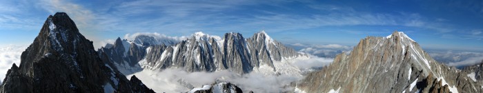Aiguille de l'A Neuve 17-18.08.13: Argentière-Lognan (1974) -- Refuge d'Argentière (2771) -- Col du Tour Noir (3534) -- Aiguille de l'A Neuve (3753) и обратно (с одной ночевкой в избушке). Изначально собирались на соседнюю Tour Noir, но нас напугали камнепадами, и мы изменили маршрут. В результате пролезли по замечательному несложному гребню (Col du Tour Noir -- Aig. de l'A Neuve), еще не задокументированному в интернете (говорят, что в каких-то швейцарских книгах этот маршрут описан). Участок Aig. de l'A Neuve -- Col Sup. du Toir Noir -- Tour Noir в принципе тоже проходим, но на него у нас уже совершенно не хватало времени. Кулуар Col Sup. du Tour Noir сейчас растаял до непроходимого состояния (до следующей зимы). И в конце успели на последнюю канатку вниз за 10 минут до отправления.  И панорамка с Aig. de l'A Neuve (кликабельна): |