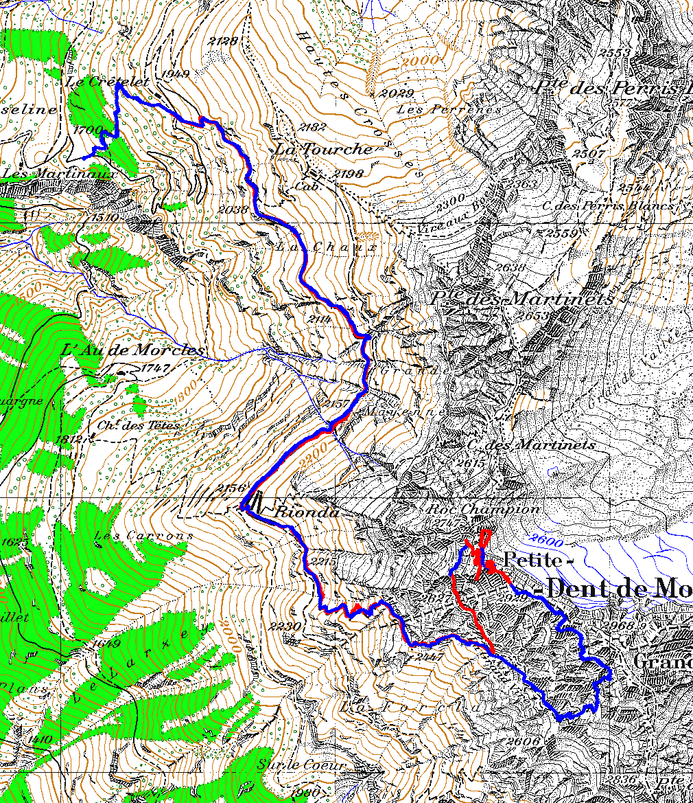 Petite Dent de Morcles Вылазка недельной давности: 28.09.13: Petite Dent de Morcles (2929) la voie du Roc Champion. Последний лазательный участок оказался непрост (в описании III, но казалось, что скорее IV: S. пролез его первым, зависая и ругаясь, я лез вторым и все равно сжульничал, качнувшись маятником на френде; правда, лезли в ботинках, а не в тапочках). Трек GPS с сильным шумом в районе Col du Champion (отражения от скал). |