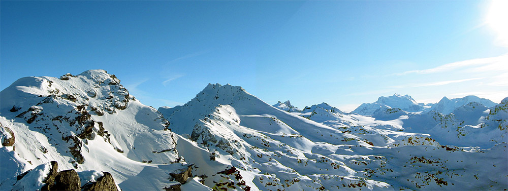 Неделю назад, 10.01.09: Siviez (1733) -- Les Louerettes (3069) и обратно. До основной вершины немного не дошли по гребню, остановились на повороте, метров на 20 ниже. На панораме (слева направо): Les Louerettes, Le Métailler, Grand Combin.
