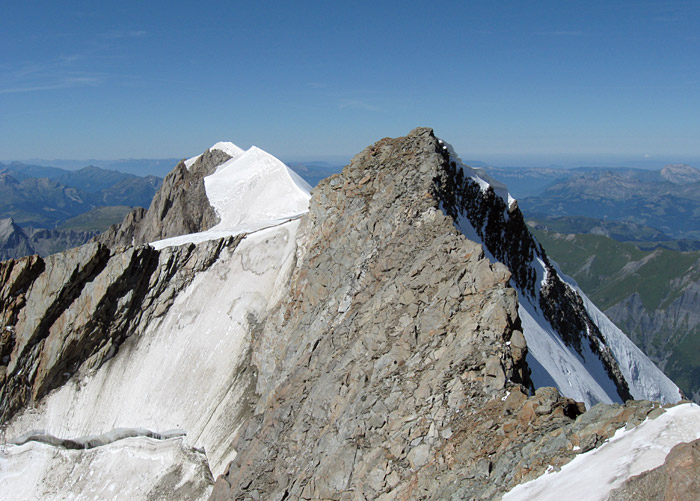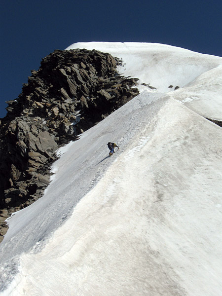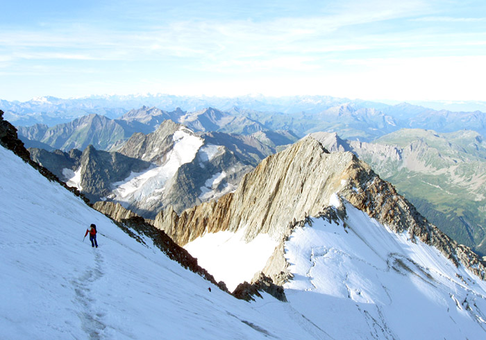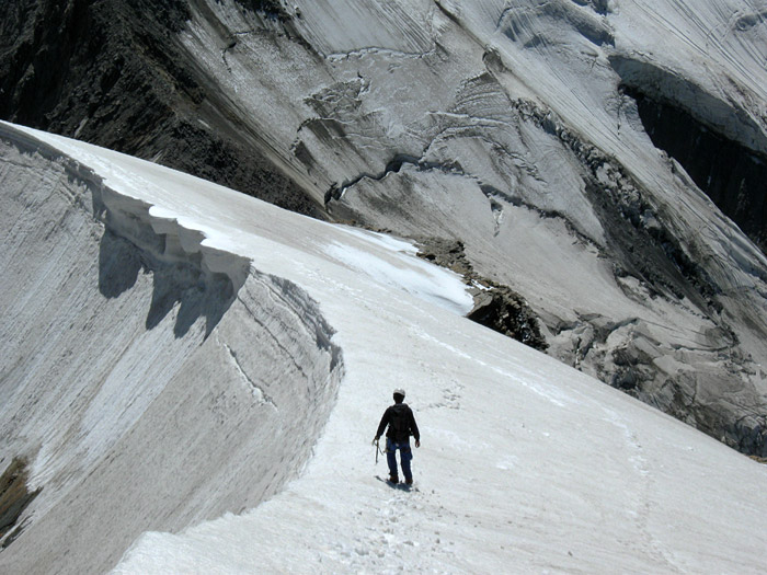 Еще несколько фотографий с похода Dômes de Miage -- Aiguille de Bionnassay.Тропинка на первый Dôme:Скальная перемычка между четвертым и пятым:Вид на спуск с пятого (последнего) Dôme со стороны Refuge Durier:Вершина Aiguille de Bionnassay (на горизонте Dôme du Goûter и Mont Blanc):Последний снежник перед вершиной (снято на спуске):Спуск по снежнику на южном гребне Aiguille de Bionnassay: