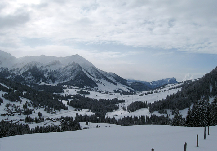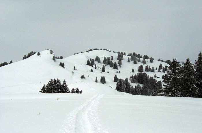Сегодня наконец-то выполнил давнюю задумку и сходил в гору со сноубордом (вверх на снегоступах, вниз на борде). Для тестовой прогулки был выбран очень простенький маршрут, который оказался очень приятным: La Lécherette (1379) -- Monts Chevreuils (1749) -- Les Moulins (890). Чуть ниже вершины находится ресторанчик: когда-то это была верхняя станция горнолыжного подъемника, но с 2000 года подъемник закрыли (за что им огромное спасибо), а ресторанчик остался, и теперь зимой туда можно дойти только на лыжах или снегоступах. Тем не менее, сегодня там почти все столики были заняты: два человека даже пришли туда на беговых лыжах (все остальные -- на альпинистских лыжах или снегоступах).