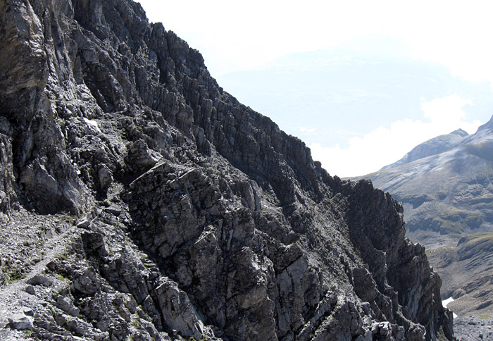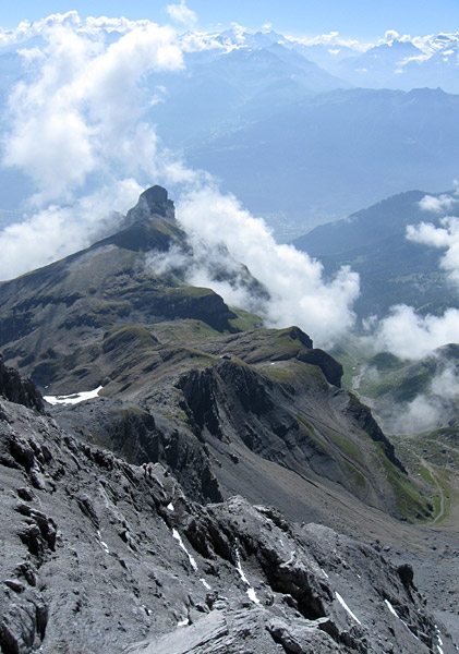 21.08.10: В субботу наконец-то совершил давнюю задумку: залез на Grand Muveran (3051). Получилось 3.5 часа подъема от Ovronnaz (1500) через Cabane Rambert и совсем не страшно: путь от избушки до вершины очень хорошо размечен и весьма популярен. На первой картинке найдите тропинку: