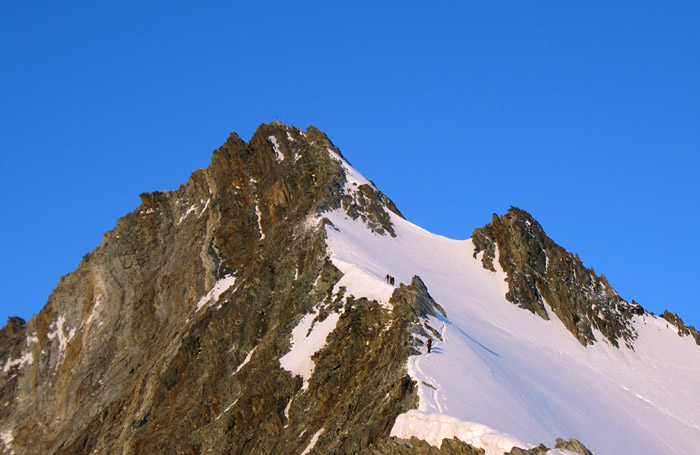 Balfrin 21.09.08: Bordierhütte (2886) -- Riedgletscher -- Balfrin (3796) -- Gross Bigerhorn (3626) -- Bordierhütte -- Gasenried (1659). Гребень был уже присыпан снегом, и нам сильно помогли следы вот этих товарищей, которые накануне прошли его в противоположном направлении (да еще с палаткой!). У нас подъем (избушка - основная вершина) занял 4:40, спуск через гребень (до избушки) -- 4:20 (потом еще 2:40 почти бегом на последний автобус). ( три картинки ) |