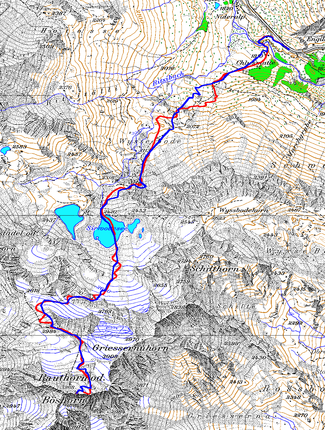 Böshorn 05.05.13: Engiloch (1800) -- Böshorn (3268). До самой вершины не дошли (метров 70 по высоте оставалось): наверху попали в облако и решили последний скальный гребень не лезть. Будет повод еще раз сходить на эту прекрасную горку. Трек и карта (кликабельна для увеличения): ( а также несколько фотографий ) | Monday, April 29th, 2013 | 8:22 am |