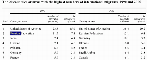 иммиграция в Россию РИАН сообщает: На днях генеральный секретарь Кофи Аннан объявил о том, что Россия вышла на вторую позицию в мире по числу прибывающих мигрантов. По данным Генсека ООН, численность мигрантов из других стран, проживающих на территории России, в 2005 году достигла 12,1 млн. человек, что составляет более 6% от общего числа мигрантов в мире. Больше – только в США - "стране, построенной на иммиграции". Здесь, по данным ООН, проживают 38,4 млн. мигрантов (20% от общего числа). Сразу за Штатами и Россией следуют Германия (10,1 млн., 5,3%) и Украина (6,8 млн., 3,6%).Соперничать с Россией, по мнению Аннана, могут только такие страны, как Канада, Австралия и Чешская Республика. Эти "четыре развитые страны активно поощряют миграцию, с тем чтобы увеличить число прибывающих в них мигрантов в целях удовлетворения своих национальных потребностей", - доложил генеральный секретарь ООН. Аннан добавил, что приток иностранных граждан в РФ объясняется не только тем, что Россия находится в центре различных миграционных потоков, но и "правильной и адекватной" работой руководства страны, благодаря которой "в Российскую Федерацию стало прибывать все больше временных трудящихся-мигрантов". Среди важных источников рабочей силы для нашей страны, помимо стран СНГ, названы Китай, Турция и Вьетнам. "Масштабный ляп" или аванс? Доклад, представленный на 39-ой сессии комиссии ООН по народонаселению и развитию, вызвал очень противоречивые комментарии в российских СМИ. Многие эксперты указывают на неточность озвученных Аннаном данных о численности мигрантов в России. При этом со ссылкой на главу Федеральной миграционной службы РФ Константина Ромодановского озвученные генсеком ООН цифры признаются и сильно заниженными ("в Россию ежегодно приезжает более 20 млн мигрантов, из которых 10 млн оседают нелегально"), и сильно завышенными ("мигрантов в России не двенадцать миллионов, а пять-семь"). Вызывают иронические замечания и слова генсека ООН о "правильной" миграционной политике российских властей. Журналисты вспоминают и закон 2002 года, приравнявших бывших соотечественников из стран СНГ к иностранным гражданам, и большую "взяткоемкость" миграционного законодательства, и колоссальных размах нелегальной миграции, никак не поддающейся легализации. Что касается привлекательности России для иммигрантов, то, как замечают многие, желающих обосноваться в России может насторожить негативное отношение россиян к чужеземцам. В итоге СМИ заключают, что затянувшийся кризис ООН начинает сказываться на качестве аналитических материалов. REGNUM "Европа будет стоять перед нами на коленях": Павел Бородин США зафиксировали языковой раскол Украины "Пока Эстония ждала удара с Востока, её обошли с Запада" Украина рискует повторить судьбу Речи Посполитой С другой стороны, отмечается, что похвала в адрес российских властей может быть "авансом" за недавно высказанное намерение Федеральной миграционной службы повысить миграционную привлекательность России и упростить процедуру трудоустройства иностранцев. Напомним, что в настоящее время продолжается работа над законопроектом "О внесении изменений в Федеральный закон "О правовом положении иностранных граждан в Российской Федерации" и "О миграционном учете иностранных граждан и лиц без гражданства Российской Федерации". По этому докумен